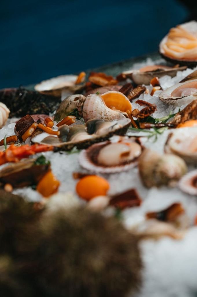 El ambiente del restaurante acompaña esa propuesta. El espacio está diseñado con tonos inspirados en la costa. También hay detalles náuticos y proyecciones que muestran playas del norte de Chile. Un gran estanque de mariscos vivos —machas, ostras, almejas, locos, picorocos y centollas—. Esto refuerza la conexión directa entre el mar y el plato.